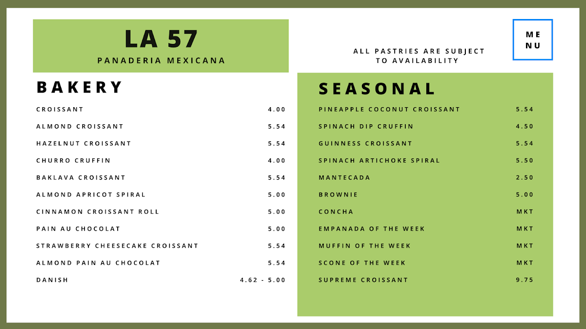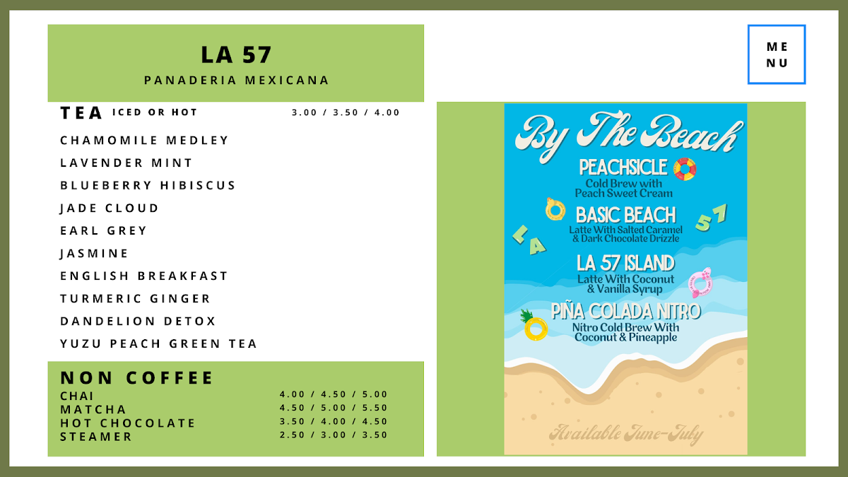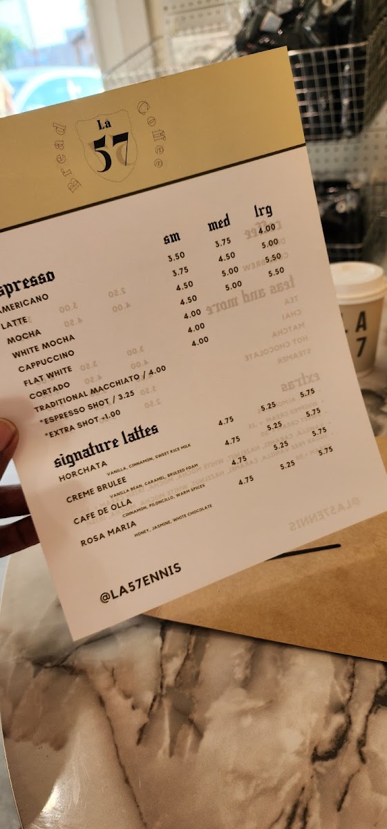 Welcome to La 57, a charming coffee shop located at 200 SE Main St, Ennis, TX, where the warmth of Mexican culture meets artisan coffee and pastries. Inspired by a highway in Mexico, this café offers a delightful menu to satisfy your cravings. Start your day with a rich Americano or dive into a flavorful Horchata latte, perfectly paired with their pastry selection.
